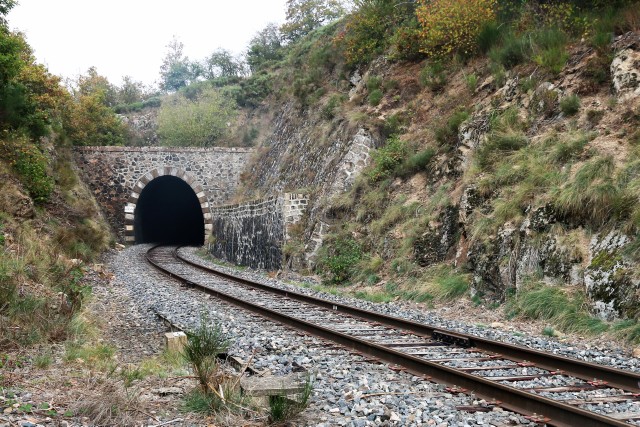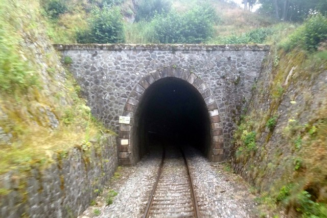 Commentaire image : En courbe de 270 m de rayon, le tunnel du Bois de Laisne est encadré par deux tranchées de 13 m et de 12 m de hauteur respective. On voit ici le débouché côté Alès du souterrain. | ![]() |