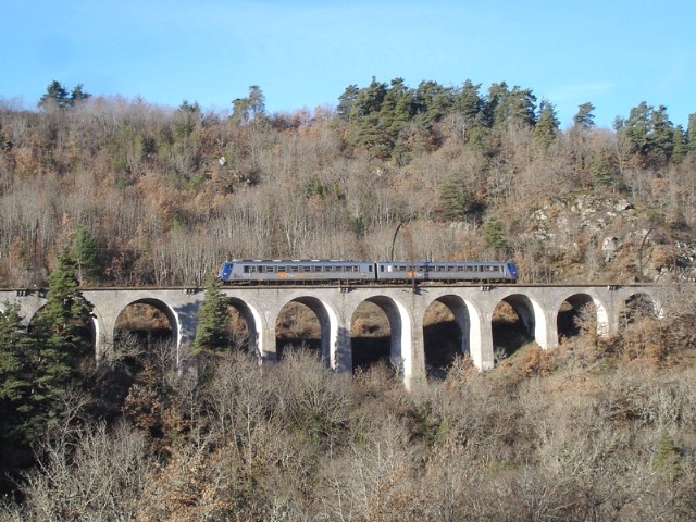 | Commentaire photo - Un TER Millau - Saint Chély (vers la droite) domine le vallon de Merdaric. Depuis décembre 2007, il est assuré par une Z2, en lieu et place d'un X 2100. | |