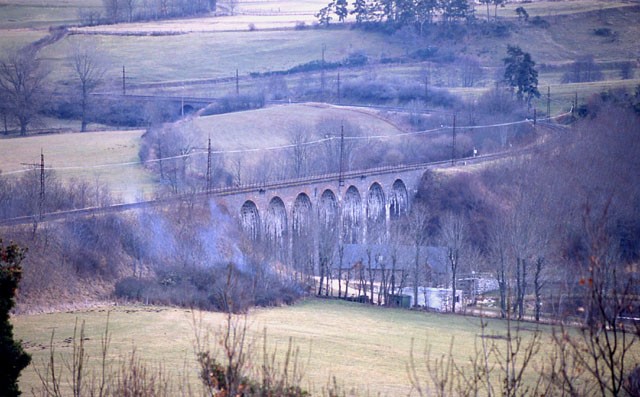 | Commentaire photo - Le ministre Gayssot l'a rêvé, mais personne ne l'a fait. Imaginez un instant, dans la belle courbe précédant le viaduc, un long train de conteneurs bleus et jaunes...La mondialisation des échanges égarée au milieu des espaces pastoraux... Le diable et le bon dieu... | |