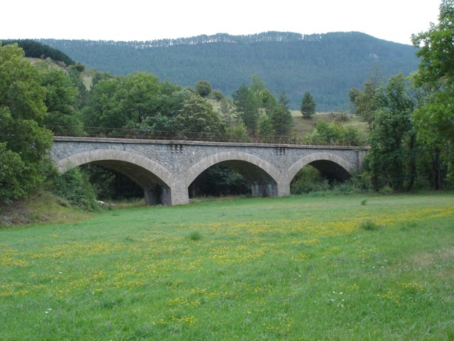 | Commentaire photo - Le sombre versant du causse de Mende domine le site. La direction de la Bastide_Saint Laurent les Bains est à gauche. | |