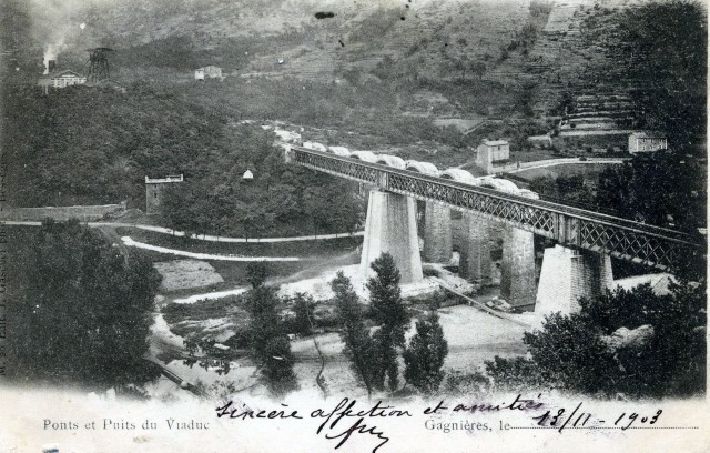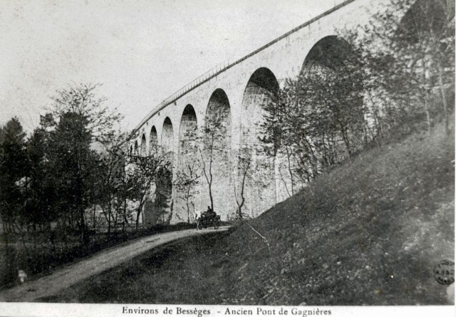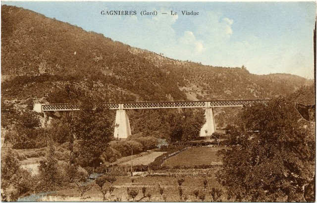 | Commentaire photo - L'ouvrage est à cheval entre les communes de Gagnières, à droite, et de Bessèges, à gauche. On le voit aux environs de 1930. Son tablier sera démonté à la fin des années 1980. | |