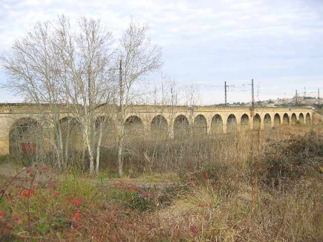 | Observations - Les 28 arches en maçonnerie de l'ouvrage franchissent le lit majeur, ordinairement à sec, du Vidourle. C'est une réplique moins longue du viaduc de Nîmes, qui ne compte pas moins de 208 arches. Charles Didion, le constructeur du chemin de fer de Montpellier à Nîmes, avait compris qu'il ne fallait pas opposer de remblais aux eaux furieuses dévalant épisodiquement des Cévennes. | |