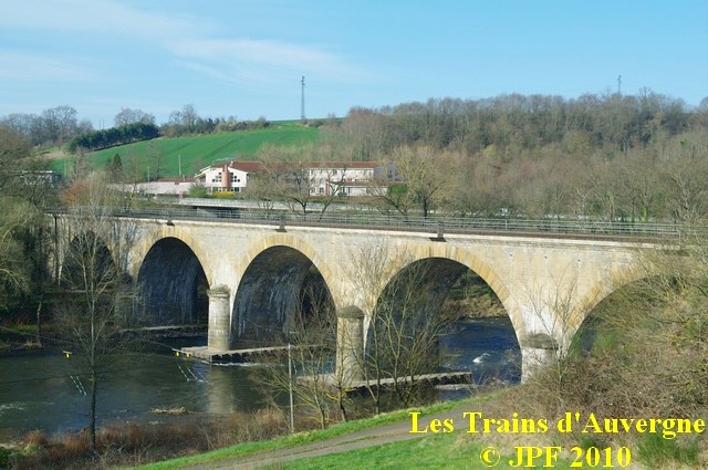 | Commentaire photo - Au delà du viaduc, vers le Midi, la ligne des Cévennes va quitter un tracé particulièrement sinueux entre méandres et coteaux, pour filer plus droit dans la lumineuse Limagne d'Issoire, aux allures de Toscane. | |