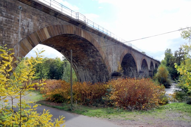| Commentaire image - Cette vue par l'aval du viaduc du Piat sur l'Allier permet de compter les arches de l'ouvrage, qui est assorti de deux repères de nivellement : 365,212 m en rive droite et 366,072 m en rive gauche. | ![]() |