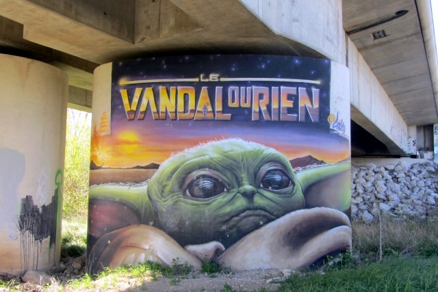 | Commentaire image - Tandis que, en raison de la pandémie, les TGV se raréfient sur le viaduc de la plaine du Gardon, en dessous, c'est un déchaînement libertaire. Les piles de l'ouvrage servent de chevalets aux tagueurs, tandis que ses poutres offrent un squatt ombragé aux marginaux de tout poil. | ![]() |