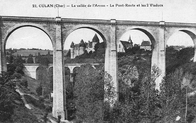| Observations - Le double viaduc de Culan, avec ses 11 arches de 12 m d'ouverture puis ses 5 arches de 20 m d'ouverture, enfonce ses piles dans les Gorges de l'Arnon. | |