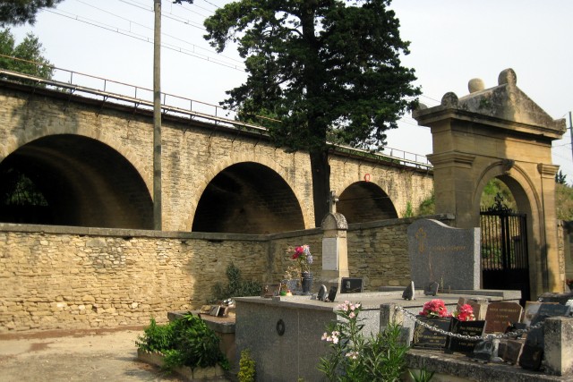 | Commentaire photo - Surveillant le cimetière, la ligne se hisse, non pas au paradis, mais sur le plateau des Costières, au moyen de la seule rampe - à peine 1 mm/m - de l'itinéraire de la rive droite du Rhône. La direction de Nîmes est à gauche. | |