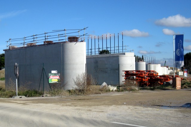 | Commentaire image - Les 17 piles de l'estacades sont prêtes à recevoir leurs 4 tabliers en béton. A droite, flotte l'oriflamme d'Oc'Via Construction, l'une des deux entités du maître d'ouvrage, avec Oc'Via Maintenance. La direction de Nîmes est au fond. Juste au nord de cet ouvrage, la société Vinci coule les piles - quatre de front - du viaduc parallèle de l'autoroute A9b. | ![]() |