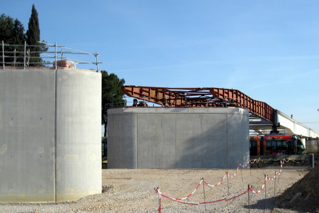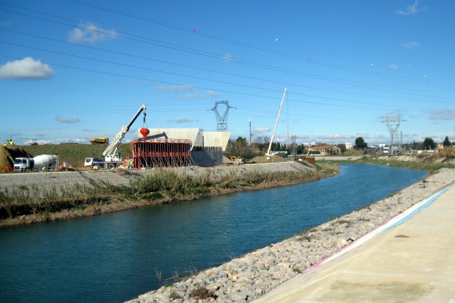 | Commentaire image - Le poussage du viaduc de la Lironde est ici bien avancé, même si des périodes de mistral intense ont ralenti l'opération. On remarque le passage d'un tramway sous l'ouvrage. | ![]() |