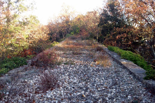 | Commentaire photo - De hautes futaies encadrent l'ouvrage, qui a perdu ses rambardes mais conservé son ballast. Au fond, côté Uzès, un grillage défoncé barre moins le passage que la végétation qui lui succède. | |