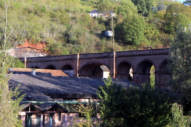 | Commentaire photo - En février 2018, certains bâtiments, plaqués contre les piles, ont été démolis, dégageant la vue sur un "monument" devenu emblématique de Marcillac Vallon. L'espace rendu disponible doit devenir une aire de covoiturage, la nouvelle gare en quelque sorte. La direction de Decazeville est à droite, le bourg derrière le photographe. | |