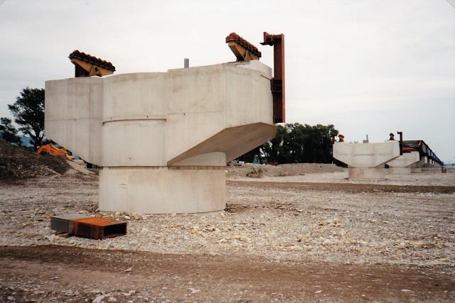 | Commentaire image - L'une des 49 piles circulaires en béton de l'ouvrage est prête à accueillir le tablier mixte bi-poutres en cours de poussage (notez les rouleaux et les guides latéraux). La longueur moyenne des portées est de 51 m. | ![]() |