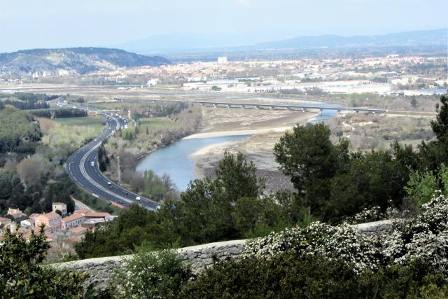 | Commentaire photo - Au fond, la Colline Saint Jacques domine l'agglomération de Cavaillon. Au centre, sous le viaduc de la LGV, la rivière présente un niveau anormalement bas. A gauche, l'Autoroute du Soleil frôle le village d'Orgon. Le photographe regarde vers le nord. | |