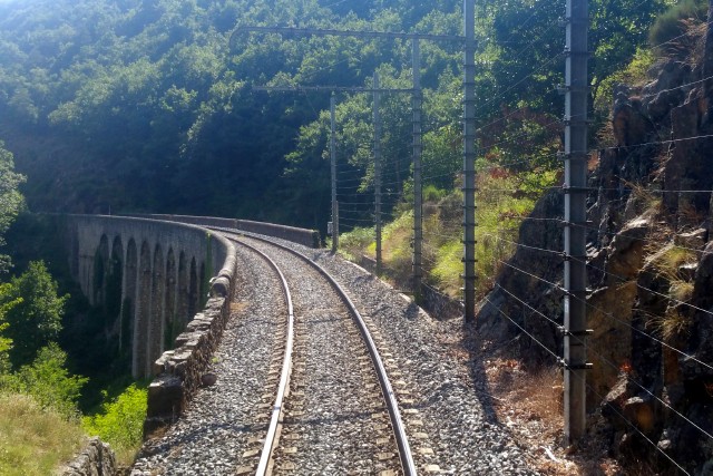 Commentaire photo - Le parapet, au premier plan, a "morflé" : peut-être une chute de rochers. On a peine à imaginer l'Administration autoriser l'aménagement d'une voie verte au fond d'une gorge somme toute assez inhospitalière. Les équipements de sécurité (gardes-corps réglementaires, éclairage des tunnels, etc...) seraient tout bonnement infinançables, au regard de retombées limitées. Les ouvrages de la ligne des Cévennes sont-ils seulement voués à offrir à la vue des derniers pêcheurs des ruines nostalgiques dominant le cours impétueux d'une rivière indifférente? La direction d'Alès est au fond. | |