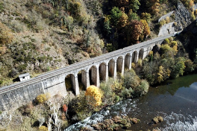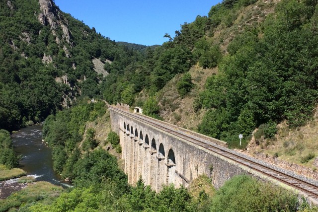 Commentaire image - Au printemps 2018, plus aucun train ne circulait entre Arvant et la Bastide, en raison, non seulement de travaux (notamment ceux de confortement du tunnel de Crest), mais encore de l'interminable mouvement social alternant deux jours de grève et trois jours de non-grève (les pires). De surcroît, pas un bus ne reliait Langeac à Langogne. Durant de longues semaines, seul le roulement des eaux de l'Allier a animé le site du viaduc de la Bassette. | ![]() |