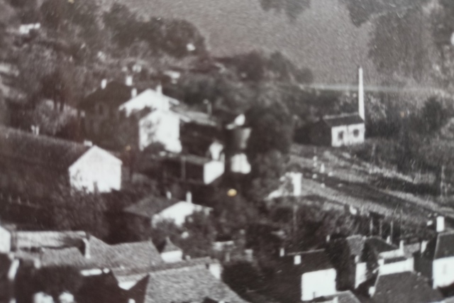 | Commentaire image : Cette vue cavalière ancienne de Cajarc, où l'on distingue le BV et le château d'eau, lève le doute sur l'emplacement de la station de pompage, rasée vers 1980 : elle s'élevait entre le plateau des voies et le Lot | ![]() |