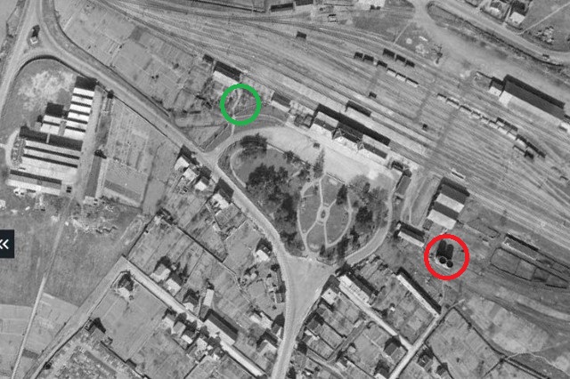 | Commentaire image : Sur cette vue aérienne de 1948, le cercle rouge situe les deux châteaux d'eau PO, rasés à la fin des années 1960. Le cercle vert localise le château d'eau actuel, bas sur patte et tout en ciment, apparu à la même époque, non pas pour alimenter les locomotives en voie de disparition, mais pour apporter l'eau courante à tous les blancois, le site dominant la ville et la campagne. | ![]() |