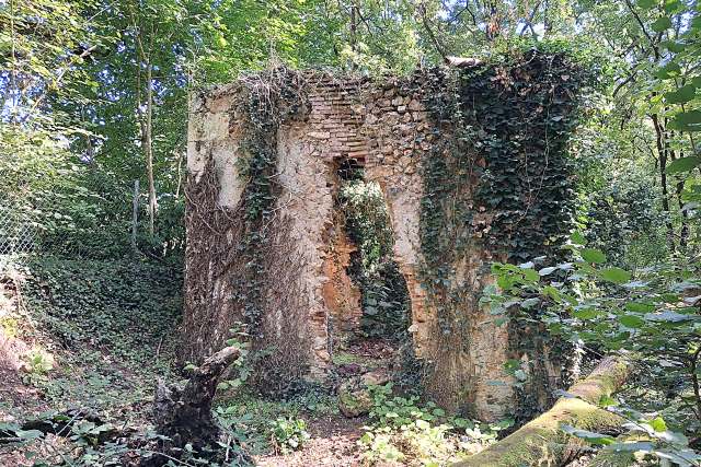 | Commentaire photo - Sur une parcelle cadastrée 0446, cette ruine perdue dans la végétation, de facture quelque peu ferroviaire, se situe à proximité de la voie ferrée sur le rebord du plateau, au sommet de la forte rampe que la canalisation d'amenée devait affronter. Cette construction pouvait abriter un regard pour la surveillance et l'entretien des conduites, ou servir de réservoir intermédiaire, voire de station de pompage secondaire. | |
