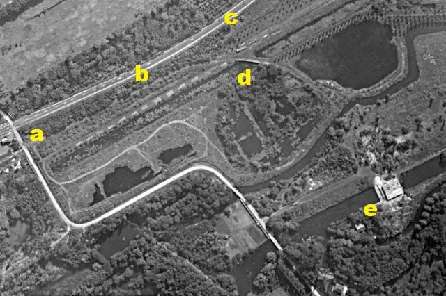 photo - a) PN 20 de la ligne de Villeneuve à Montargis. b) Origine de l'embranchement. c) Direction de Montargis. d) Pont-rail sur un bras mort de l'Essonne. e) Emplacement de la papeterie, en partie détruite en 1953, année de la photo aérienne. |