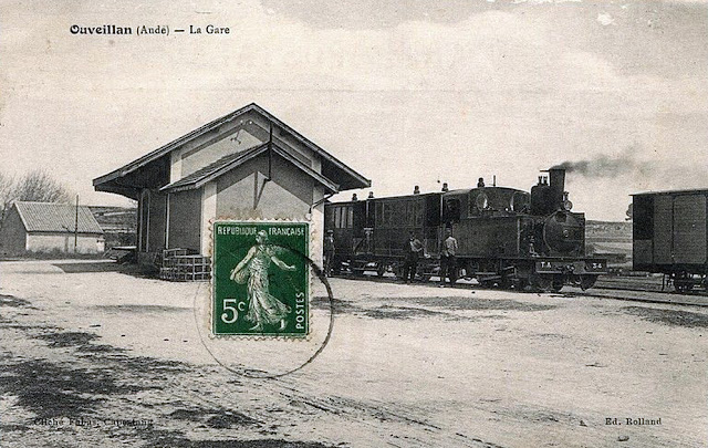 | Commentaire photo : La gare se situait au nord du village, à l'emplacement actuel de l'importante Cave Coopérative, créée en 1936, deux ans après le déclassement de la ligne. Ou comment changer, non pas l'eau, mais la vapeur en vin... | |