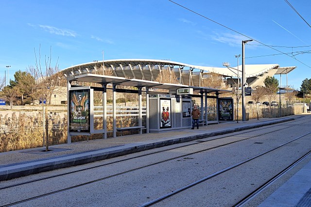 | Commentaire photo : La ligne 5 longe ici le Complexe sportif Yves du Manoir, dont le "joyau", le Septeo Stadium (nom actuel), sert de toile de fond au quai direction les Grès de Montpellier. | |