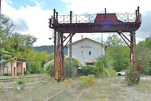 | Commentaire photo : Sans voyageurs depuis plus d'un demi-siècle, l'endroit se singularise par ce portique roulant électrique installé à la fin des années 1950 pour charger du bois. Limité à 10 t, cet équipement n'a pas été retenu pour le transfert des "colis" de plusieurs centaines de tonnes destinés au réacteur ITER et ayant exigé la mise au gabarit XXL d'un itinéraire routier spécialisé depuis Fos sur Mer. | |
