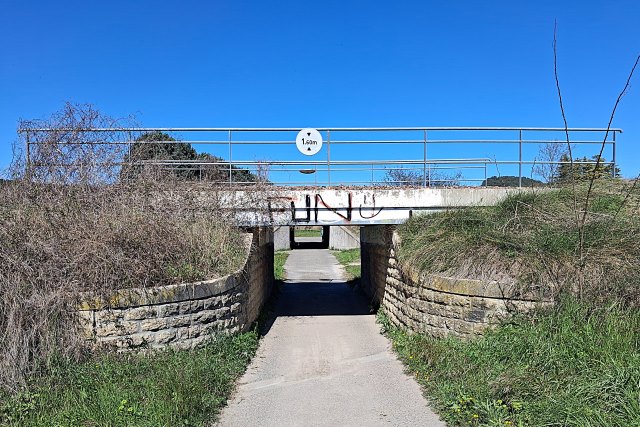 | Commentaire photo - On aperçoit, tout au fond, à travers cet ouvrage bas de plafond, les culées de la déviation routière de Villelaure, mise en place de 2009 à 2017. La direction de Pertuis est à droite. | |