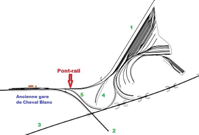 | Commentaire image : Ce plan représente l'extension maximale de la base travaux de Cheval Blanc lors de la phase d'équipement de la LGV Méditerranée. Excusez du peu. De nos jours, toutes les voies de service à l'est (à droite) du raccordement ont été déposées et les terrains rendus à l'agriculture (et non, comme souvent, quand les sols sont irrécupérables, au photovoltaïsme). 1 - Ligne Cheval Blanc - Pertuis. 2 - Ligne Avignon - Miramas. 3 - Ligne Combs laVille - Saint-Louis (LGV Méditerranée). 4 - Ancien raccordement direct Miramas - Pertuis. 5 - Raccordement LGV non électrifié. |