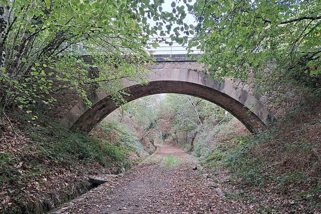 | Commentaire photo - Le parapet en pierre a été remplacé par un garde-corps métallique, ce qui constitue un sacrilège, tout simplement. A gauche, on remarque une dalle en granit : c'était un refuge pour les hommes de la voie. La direction de Saint Sébastien est au fond. | |