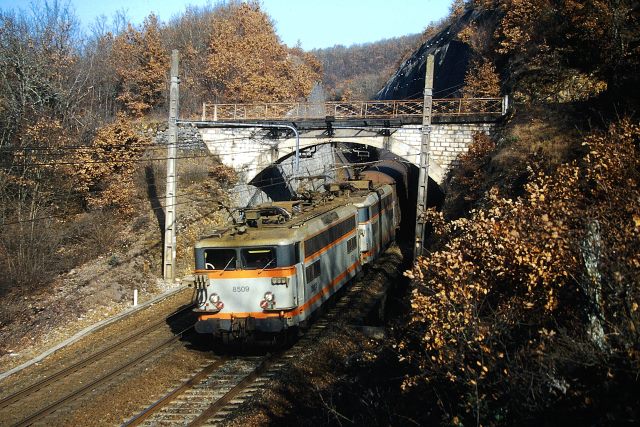 | Commentaire photo - Un train de fret, mené par une UM de BB 8500, dévale la longue pente de 10 ‰ précédant l'arrivée à Souillac. | |
