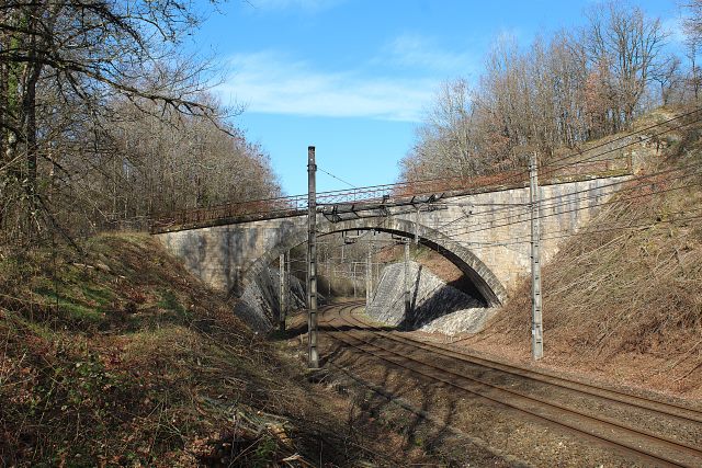 | Commentaire photo - Les équipements 1,5 kV alourdissent sensiblement la parfaite épure des belles courbes enchâssées entre terre et pierre. La direction de Brive est au fond. | |