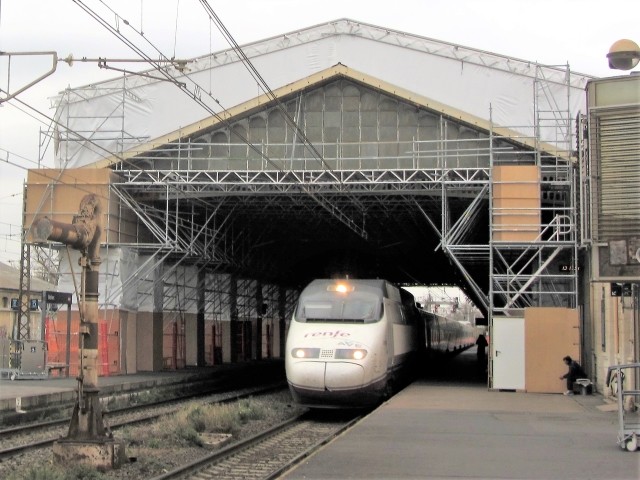 Commentaire photo - L'AVE Barcelone - Lyon traverse la gare sans arrêt sous les échafaudages. A gauche, la grue hydraulique boude ce train venant d'un pays où une ville ose s'appeler Santander. | |