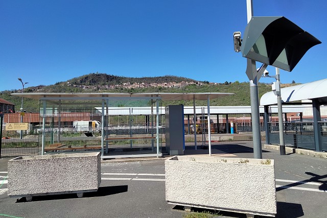 | Commentaire photo - Le village de Corent coiffe la couverture de l'abri du quai impair, tandis que les toits blancs arrondis visibles au fond et à droite protègent les escaliers du passage souterrain. Les bacs sans fleurs seraient-ils devenus des cendriers géants? | |