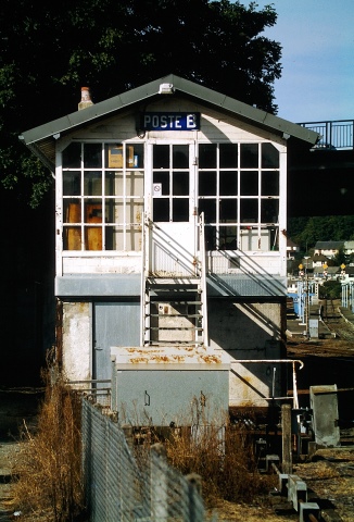 | Commentaire photo - Le poste B, vu ici peu de temps avant sa destruction en direction de la gare, se situait côté Eygurande, entre le pont-route de l'avenue de Clermont (dont on aperçoit le garde-corps) et l'ancien passage à niveau de la N 89. | |