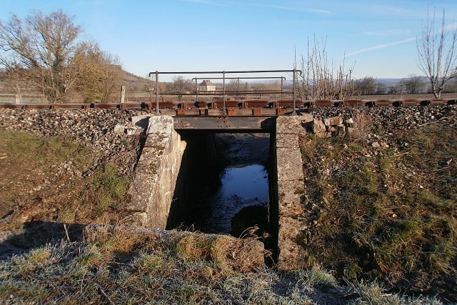 | Commentaire photo - La voie unique, alors encore active, franchit ici un fossé drainant aujourd'hui les eaux d'un étang anonyme, créé dans les années 2000, à la jonction ouest de l'ancienne N 88 et de la déviation de Laissac. La direction de Rodez est à gauche. | |