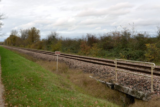 Commentaire photo - Malgré un tracé favorable, la vitesse-limite n'a jamais du dépasser ici les 120 km/h, à la fin du XXème siècle. La voie fuit vers le nord. | |