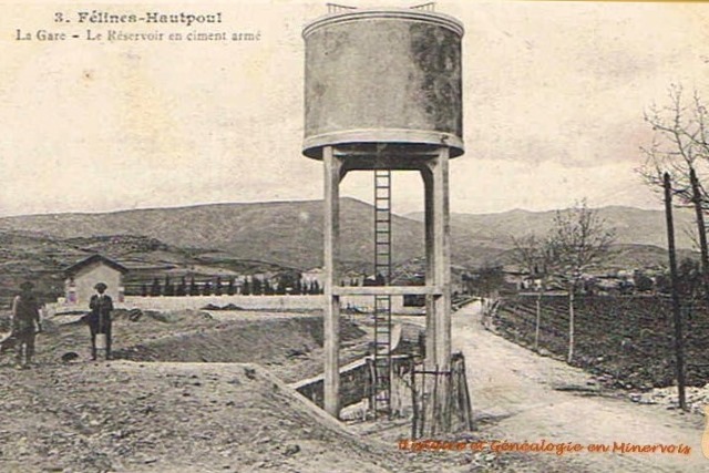 | Commentaire photo - A cette époque, le ciment armé est déjà systématiquement utilisé par les concédants nécessiteux. Ce château d'eau continuera à figurer sur les cartes jusque dans les années 1950. Peut-être possédait-il une utilité pour les vignerons (on ne disait pas encore viticulteurs) venus remplir ou nettoyer leurs citernes de traitement. La gare paraît encore en chantier. | |