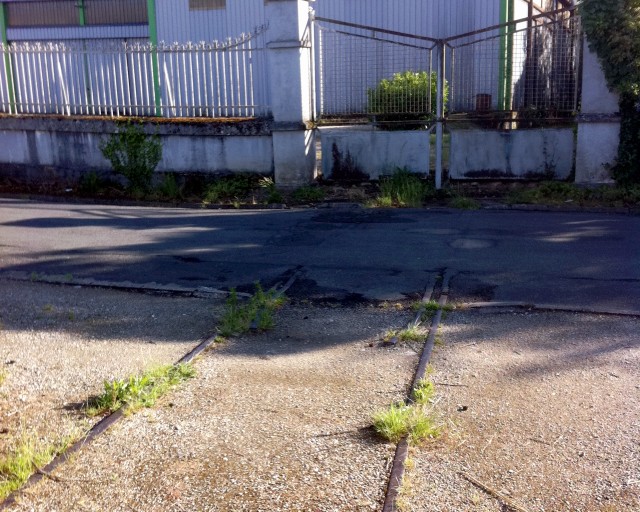 Commentaire photo - L'antenne a conservé ses rails tout au long de son parcours dans une trouée verte : elle traverse ici l'avenue de la Prune d'Ente avant de pénétrer dans les emprises de l'actuelle société Castel et Fromaget (Groupe Fayat : Villa Méditerranée à Marseille, Canopée des Halles à Paris). | |