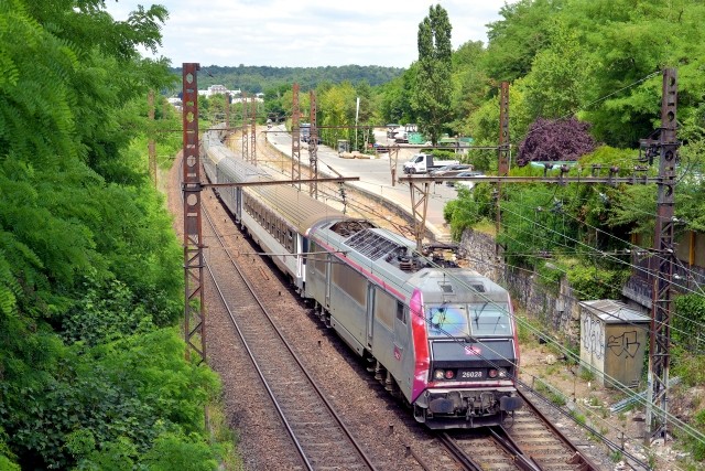 Commentaire photo - Cet InterCités Paris - Clermont dépasse l'embranchement toujours pourvu de ses deux voies. Sur l'ancien quai militaire, stationnent de pacifiques véhicules de l'Equipement. | |