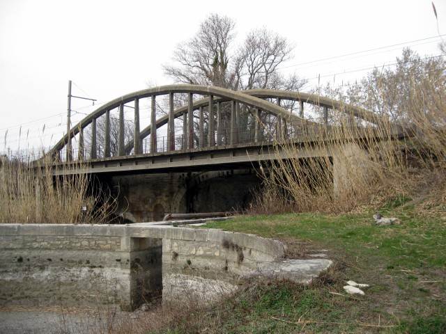 | Commentaire photo - Ce pont-rail en ciment (forcément!) a été établi après 1925 et franchit le canal de navigation du Rhône à Sète, ainsi que le canal d'irrigation de Remoulins à Fourques, dont on aperçoit au premier plan un bassin vidé, en cours de chômage. L'ouvrage de type bow-string masque le passage de la Transversale Sud finissante, désormais proche de Tarascon sur la droite. | |