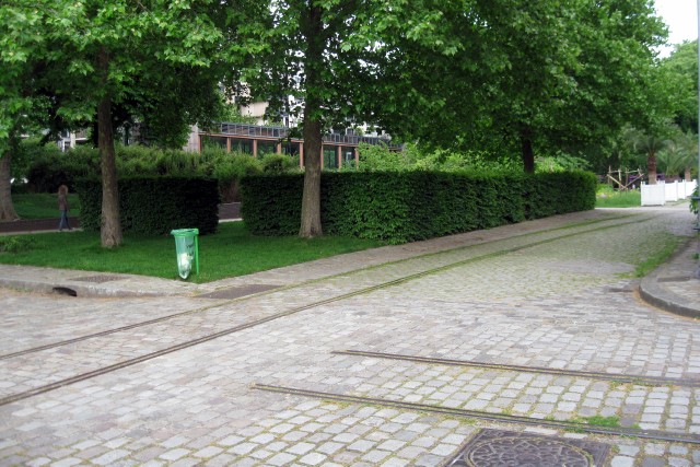 | Commentaire photo - Ce site vinicole, haut en couleurs sinon en colorants, fut désaffecté et rasé entre 1979 et 1989. De nos jours, les allées du Parc de Bercy et les rues de Bercy Village ont conservé en partie les anciennes chaussées et leur trame orthogonale. Sur les pavés, les rails. | |