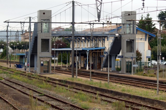 Commentaire photo : En 2014, la gare de Tonneins a cessé depuis longtemps d'être une gare de correspondance : elle est uniquement desservie par les TER Aquitaine assurant la relation Bordeaux - Agen, le trajet vers la capitale régionale demandant une heure environ. La photo, prise en direction de Toulouse, montre l'imposante passerelle, aux normes, mise en service en 2011. | |