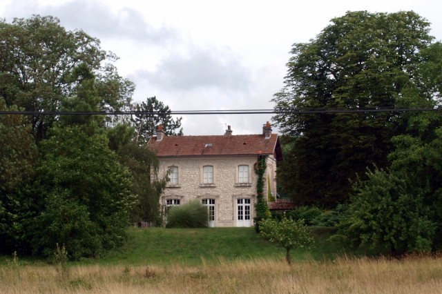 Commentaire photo : Le plateau de la gare de la Sauvetat du Dropt a été loti, mais les bâtiments ferroviaires ont été conservés pour l'essentiel. Le BV est vu (de loin) côté cour. La bifurcation donnant les directions de Bordeaux et de Marmande se trouvait vers la droite. | |