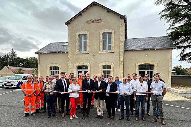 Commentaire photo : Ce jour-là, le Centre d’Exploitation et d’Entretien des Routes (C.E.E.R) de la Ville de Levroux était inauguré par les personnalités locales, rassemblées côté voies. L'ancien BV a été complètement restauré afin d’y regrouper tous les locaux de la base-vie et offrir des conditions de travail adaptées aux missions des agents d’exploitation. La direction de Châteauroux est à droite. | |