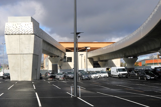 | Commentaire photo : Entre le viaduc terminus de la ligne B à gauche et celui de la ligne C à droite, on note quelques petites différences structurelles, par exemple le léger galbe des voussoirs du tablier s'élançant vers Labège_Gare. C'est que les deux ouvrages ont été construits par deux entreprises distinctes (Demathieu Bard et Bouygues respectivement). | |
