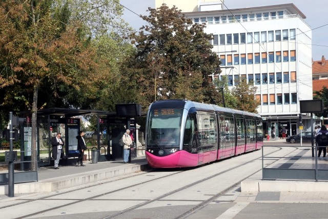 Commentaire photo : Une rame de la ligne T2 arrivant du nord de la ville va marquer l'arrêt côté ouest de la Place de la République, avant d'aborder le tronc commun avec la ligne T1 jusqu'aux abords de la gare SNCF. | |