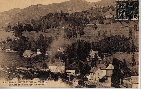 Commentaire image : Vaurs est le lieu-dit où s'est implantée la gare en 1868. On est sur la rive gauche de la Cère. Le village de Thiézac proprement dit est situé à un kilomètre environ, sur la rive droite de la Cère. Le pont de bois fut alors reconstruit en pierres. | ![]() |