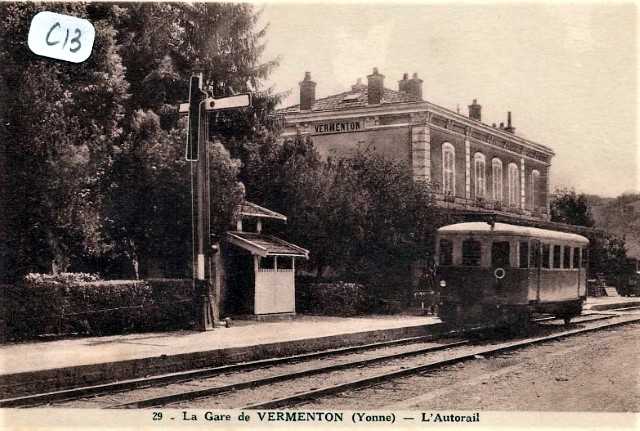 | Commentaire photo - Un autorail prototype du PLM stationne sous les volets clos du BV de Vermenton. On remarque la double voie, le double sémaphore et l'urinoir plaqué contre les lieux d'aisance, aujourd'hui disparus. | |