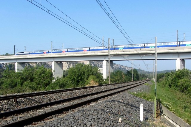 Commentaire photo - Le viaduc de Roquemaure survole les voies de la ligne de la rive droite du Rhône, vue en direction du Teil. | |