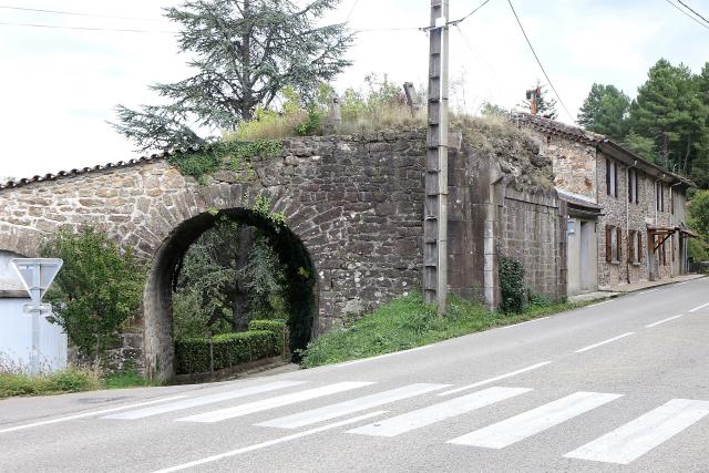 | Commentaire photo - Côté la Vernarède, la montée des berlines pleines était opérée au moyen de deux plans inclinés et de deux machines à vapeur. On voit ici, tronqué par la route, le second plan incliné (dit du Peyrerol) en rampe de 222 ‰. Le GR 700 (Chemin de Régordane) franchit le passage voûté. | |